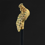 At its focal point, this cane boasts a handle fashioned in the likeness of a majestic peacock, symbolizing grace and beauty. Adorned with radiant emerald Swarovski elements, the handle adds a mesmerizing touch of sparkle and opulence to the cane, making it a standout piece that captures attention.