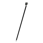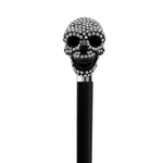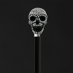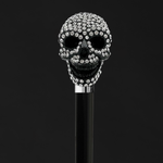 At its forefront, the walking cane features a black skull handle adorned with shimmering Swarovski crystals. The striking combination of the black skull and sparkling crystals adds a touch of opulence and intrigue to the cane, making it a standout piece that commands attention.