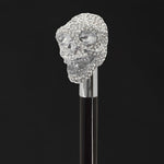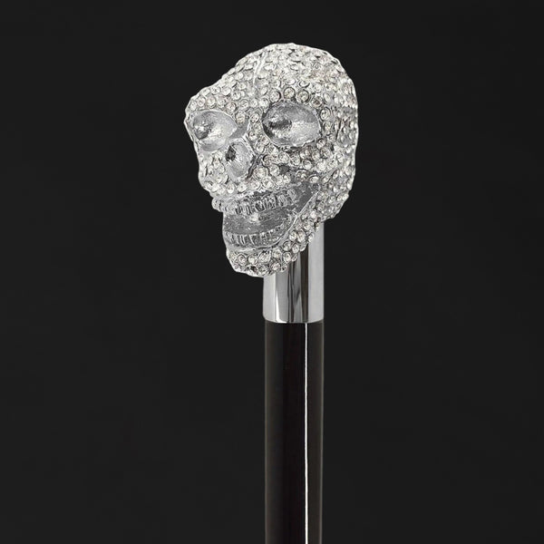At its forefront, the walking cane features a silver skull handle adorned with shimmering Swarovski crystals. The combination of the sleek silver skull and sparkling crystals adds a touch of opulence and intrigue to the cane, making it a standout piece that commands attention.