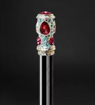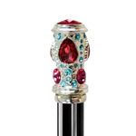 The cane features a sleek conical shaft made from solid black beech wood, known for its strength and classic appearance. At its tip, a silver-plated 925 brass ferrule adds both durability and a distinguished finish. The true centerpiece, however, is the handle – a handcrafted masterpiece made from brass, adorned with radiant crystals and finished with a refined layer of 925 silver plating. This striking design reflects light beautifully, enhancing its presence and adding a subtle touch of glamour.