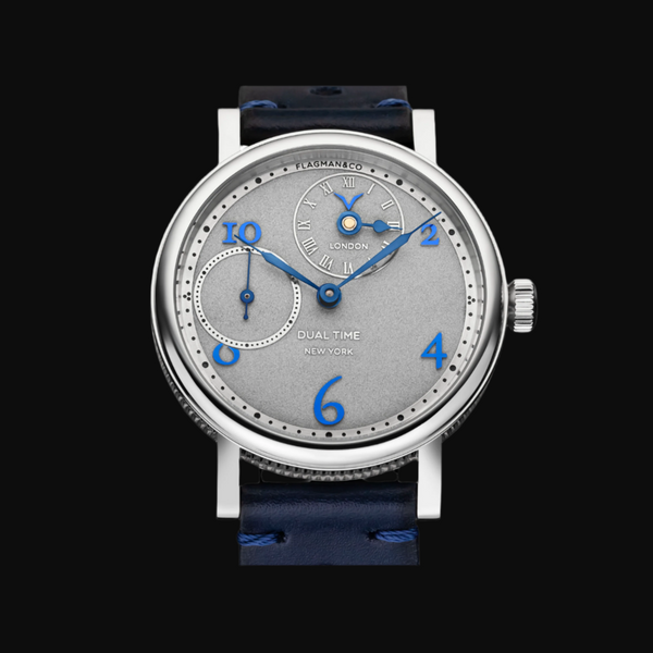 The Flagman & Co. "Dual Time (Blue)" Watch is a sophisticated timepiece designed for those who appreciate fine craftsmanship and global connectivity. This handmade mechanical watch offers the ability to track two time zones simultaneously, making it an ideal gift for travelers, professionals, and watch enthusiasts.