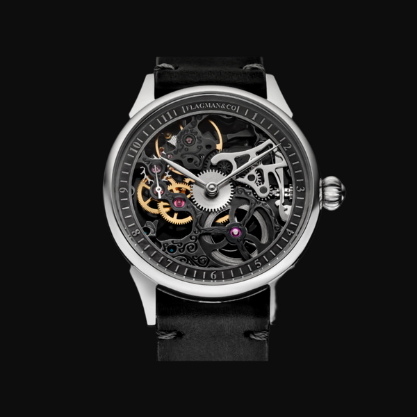 The Flagman & Co. "Graphite" Skeleton Watch is a remarkable timepiece, handcrafted by master jewelers. With its intricately engraved movement and skeletonized bridges, this watch is a true collector’s item—blending artistry, tradition, and mechanical excellence.