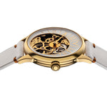 The mechanical movement is meticulously engraved and skeletonized by hand, revealing the intricate workings of the Caliber 36 mechanism. The watch face is engraved and hand-painted, adding an artistic touch to its sophisticated design.
