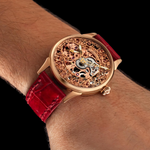 Skeletonized movement with hand-cut bridges showcasing the intricate inner workings