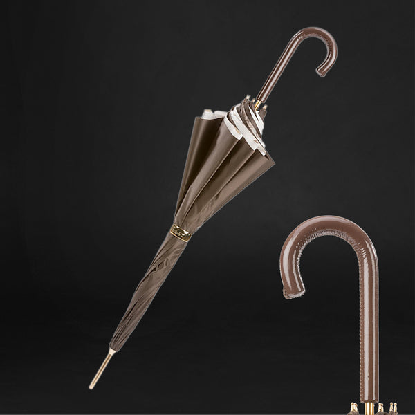 Elevate your rainy day style with the Fashionable Beige Umbrella with Bridles Print Interior and Leather Handle—a chic and enduring accessory that allows you to showcase your refined taste with a touch of luxury and flair.