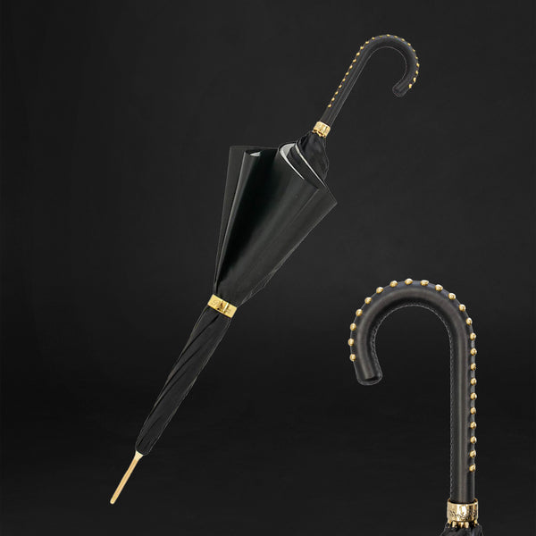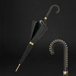Introducing the Black Double Cloth Umbrella with Bridles Print Interior and Leather Handle—a stylish and sophisticated accessory that seamlessly blends a classic double cloth design with an elegant bridle print and luxurious leather handle.