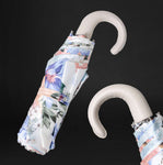 Discover the essence of elegance and purity with the Unique Folding White Umbrella, adorned with a serene Flowers print and finished with a luxurious Leather Handle, exclusively designed for women. This umbrella is a testament to timeless beauty and sophistication, offering a perfect harmony between functionality and style.