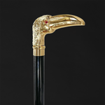At its forefront, the walking stick boasts a handle adorned with a beautifully sculpted toucan motif, plated in radiant 24K gold. The intricate detailing of the toucan exudes elegance and adds a touch of exotic allure to the cane, making it a standout piece that commands attention.