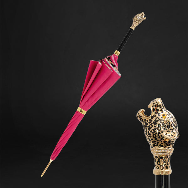 Introducing the Stylish Leopardized Panther Handle Pink Umbrella with Leopard Interior—a trendy and eye-catching accessory that seamlessly combines modern design with a touch of wild elegance.