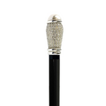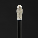 The handle of this walking cane features a stunning arrangement of sparkling crystals and a lustrous pearl, creating a dazzling focal point that complements any elegant ensemble. The intricate detailing and shimmering accents make it a true work of art.