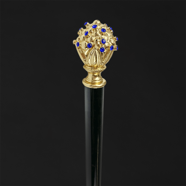 At its forefront, this walking cane features a beautifully designed knob adorned with majestic blue crystals. The deep blue crystals, expertly cut to reflect light brilliantly, add a touch of opulence and allure, making this cane a standout piece that captures attention and admiration.
