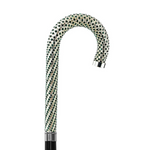 At its forefront, this walking cane boasts a handle adorned with shimmering green crystals, meticulously arranged to create a stunning display of brilliance. The rich hue of the crystals adds a touch of opulence and allure to the cane, making it a standout piece that commands attention.