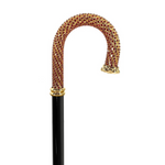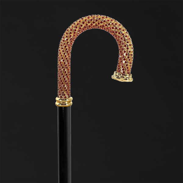 At its forefront, this walking stick features vibrant red crystals set against a backdrop of lustrous 24K gold plating. The rich hue of the crystals adds a touch of drama and sophistication, creating a stunning contrast against the radiant gold finish.