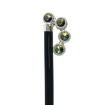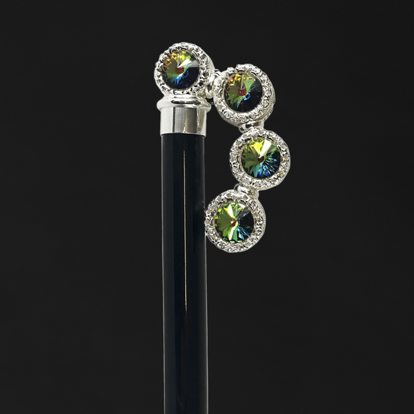 At its forefront, this walking stick boasts a handle adorned with shimmering multicolor crystals, arranged in a mesmerizing pattern that catches the light from every angle. The vibrant hues of the crystals add a touch of glamour and playfulness to the cane, making it a standout piece that commands attention.