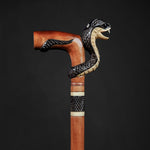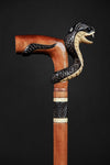 The cane features a captivating cobra head design, meticulously carved by skilled artisans. The serpent's scales are delicately etched, adding a lifelike texture to the piece. The cobra's eyes are expertly painted, giving them a mesmerizing, lifelike appearance that adds to the allure of the cane.